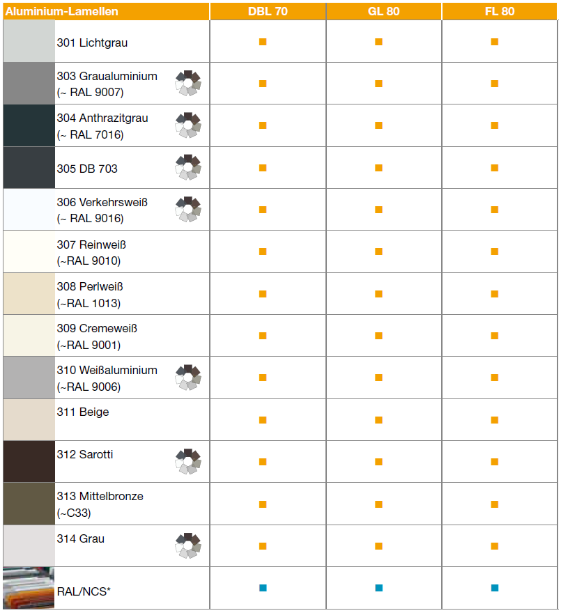 Die Raffstoren-Dreibogenlamellen DBL 70, die gebördelte Lamelle GL 80 und die Flachlamelle FL 80 können in RAL- / NCS-Behangfarben beschichtet werden. (Mehrpreis beachten!)